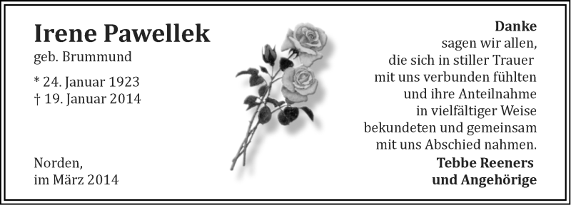 Hier finden Sie alle Traueranzeigen aus der Zeitung, die bisher für Irene Pawellek erschienen sind. Weitere Traueranzeigen, die in der Zeitung erscheinen, werden hier ebenfalls aufgelistet