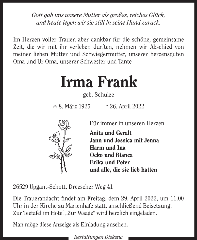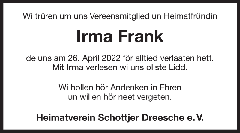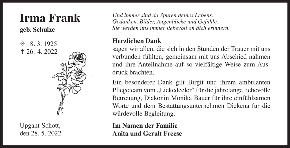 Hier finden Sie alle Traueranzeigen aus der Zeitung, die bisher für Irma Frank erschienen sind. Weitere Traueranzeigen, die in der Zeitung erscheinen, werden hier ebenfalls aufgelistet