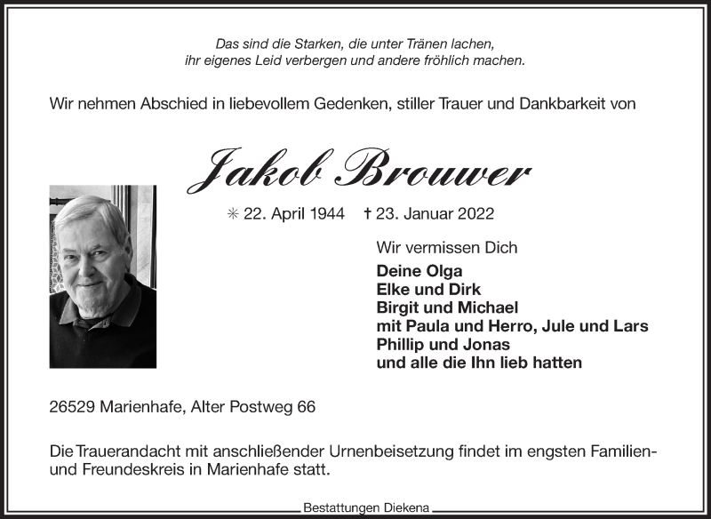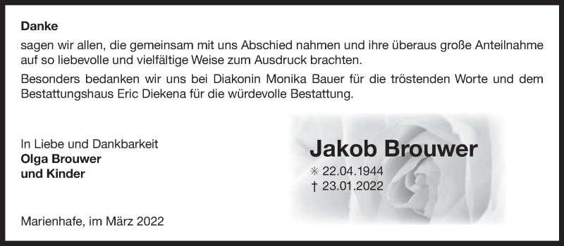 Hier finden Sie alle Traueranzeigen aus der Zeitung, die bisher für Jakob Brouwer erschienen sind. Weitere Traueranzeigen, die in der Zeitung erscheinen, werden hier ebenfalls aufgelistet
