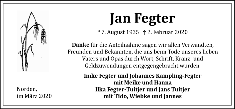 Hier finden Sie alle Traueranzeigen aus der Zeitung, die bisher für Jan Fegter erschienen sind. Weitere Traueranzeigen, die in der Zeitung erscheinen, werden hier ebenfalls aufgelistet