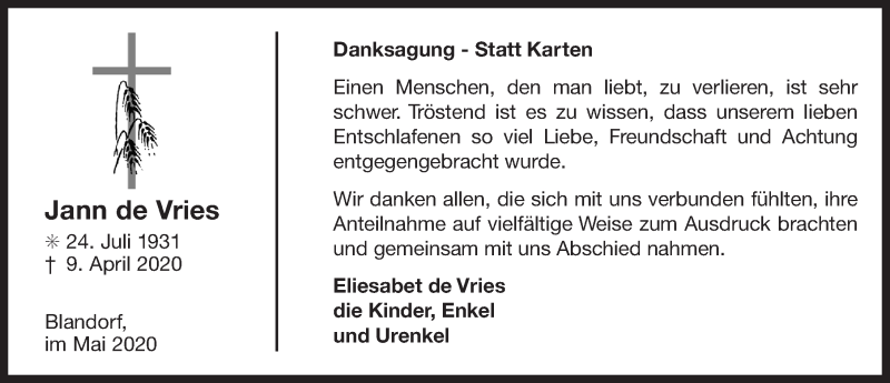 Hier finden Sie alle Traueranzeigen aus der Zeitung, die bisher für Jann de Vries erschienen sind. Weitere Traueranzeigen, die in der Zeitung erscheinen, werden hier ebenfalls aufgelistet