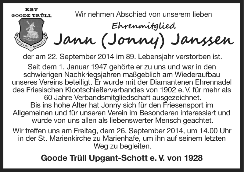 Hier finden Sie alle Traueranzeigen aus der Zeitung, die bisher für Jann Janssen erschienen sind. Weitere Traueranzeigen, die in der Zeitung erscheinen, werden hier ebenfalls aufgelistet