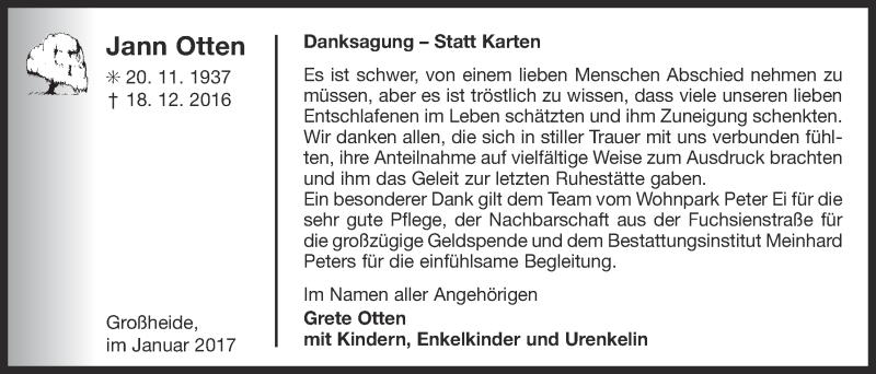 Hier finden Sie alle Traueranzeigen aus der Zeitung, die bisher für Jann Otten erschienen sind. Weitere Traueranzeigen, die in der Zeitung erscheinen, werden hier ebenfalls aufgelistet