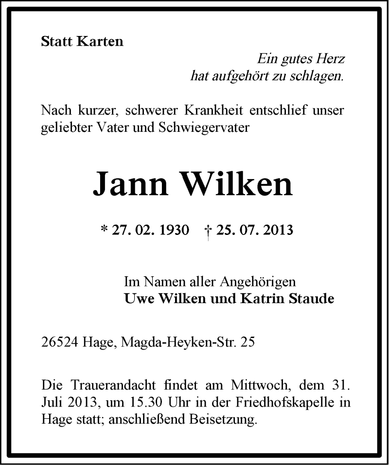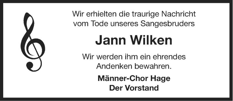 Hier finden Sie alle Traueranzeigen aus der Zeitung, die bisher für Jann Wilken erschienen sind. Weitere Traueranzeigen, die in der Zeitung erscheinen, werden hier ebenfalls aufgelistet
