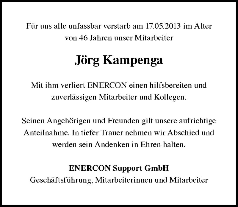 Hier finden Sie alle Traueranzeigen aus der Zeitung, die bisher für Jörg Kampenga erschienen sind. Weitere Traueranzeigen, die in der Zeitung erscheinen, werden hier ebenfalls aufgelistet