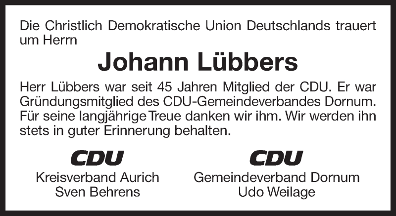 Hier finden Sie alle Traueranzeigen aus der Zeitung, die bisher für Johann Lübbers erschienen sind. Weitere Traueranzeigen, die in der Zeitung erscheinen, werden hier ebenfalls aufgelistet