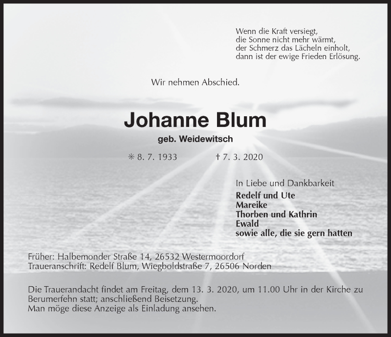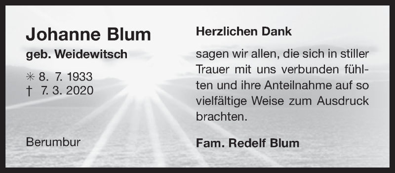 Hier finden Sie alle Traueranzeigen aus der Zeitung, die bisher für Johanne Blum erschienen sind. Weitere Traueranzeigen, die in der Zeitung erscheinen, werden hier ebenfalls aufgelistet
