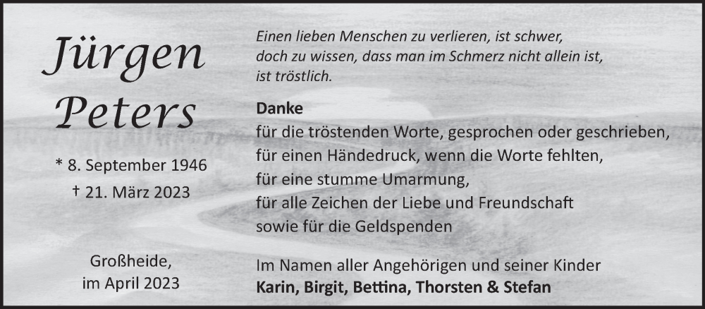 Hier finden Sie alle Traueranzeigen aus der Zeitung, die bisher für Jürgen Peters erschienen sind. Weitere Traueranzeigen, die in der Zeitung erscheinen, werden hier ebenfalls aufgelistet