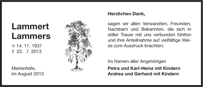 Hier finden Sie alle Traueranzeigen aus der Zeitung, die bisher für Lammert Lammers erschienen sind. Weitere Traueranzeigen, die in der Zeitung erscheinen, werden hier ebenfalls aufgelistet
