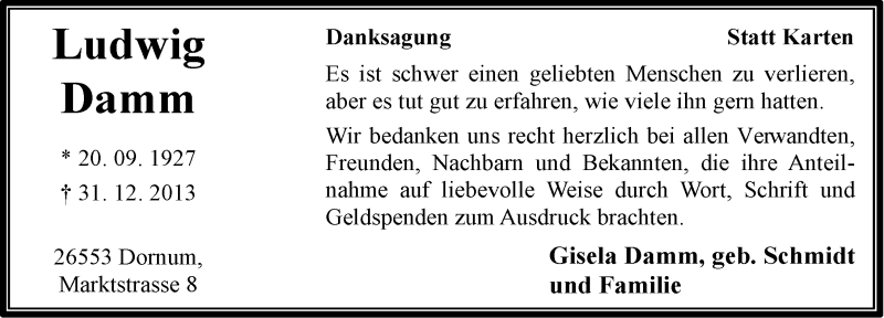 Hier finden Sie alle Traueranzeigen aus der Zeitung, die bisher für Ludwig Damm erschienen sind. Weitere Traueranzeigen, die in der Zeitung erscheinen, werden hier ebenfalls aufgelistet