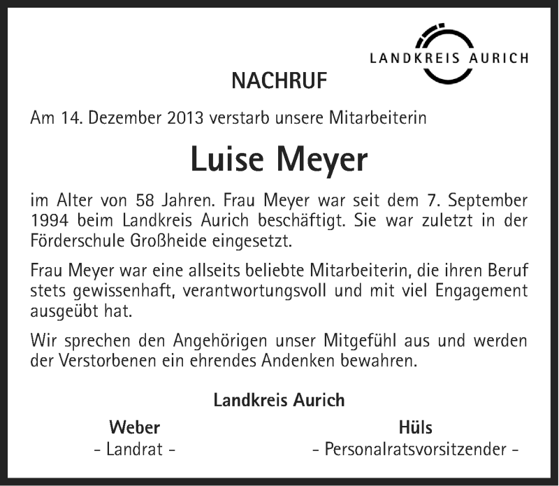 Hier finden Sie alle Traueranzeigen aus der Zeitung, die bisher für Luise Meyer erschienen sind. Weitere Traueranzeigen, die in der Zeitung erscheinen, werden hier ebenfalls aufgelistet