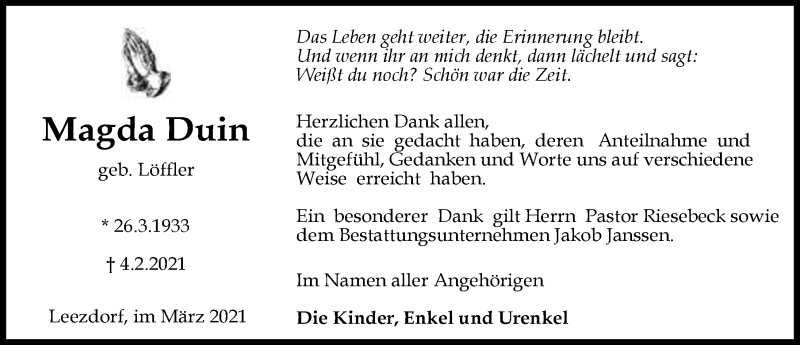 Hier finden Sie alle Traueranzeigen aus der Zeitung, die bisher für Magda Duin erschienen sind. Weitere Traueranzeigen, die in der Zeitung erscheinen, werden hier ebenfalls aufgelistet