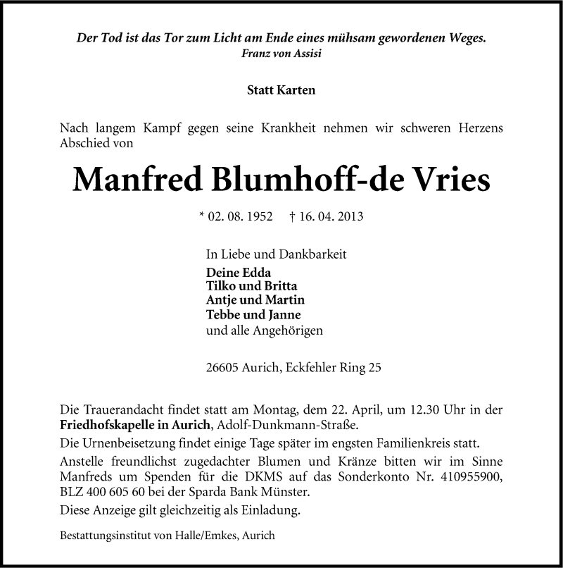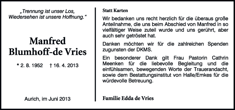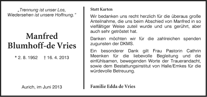 Hier finden Sie alle Traueranzeigen aus der Zeitung, die bisher für Manfred Blumhoff-de Vries erschienen sind. Weitere Traueranzeigen, die in der Zeitung erscheinen, werden hier ebenfalls aufgelistet