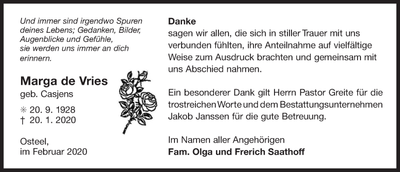 Hier finden Sie alle Traueranzeigen aus der Zeitung, die bisher für Marga de Vries erschienen sind. Weitere Traueranzeigen, die in der Zeitung erscheinen, werden hier ebenfalls aufgelistet