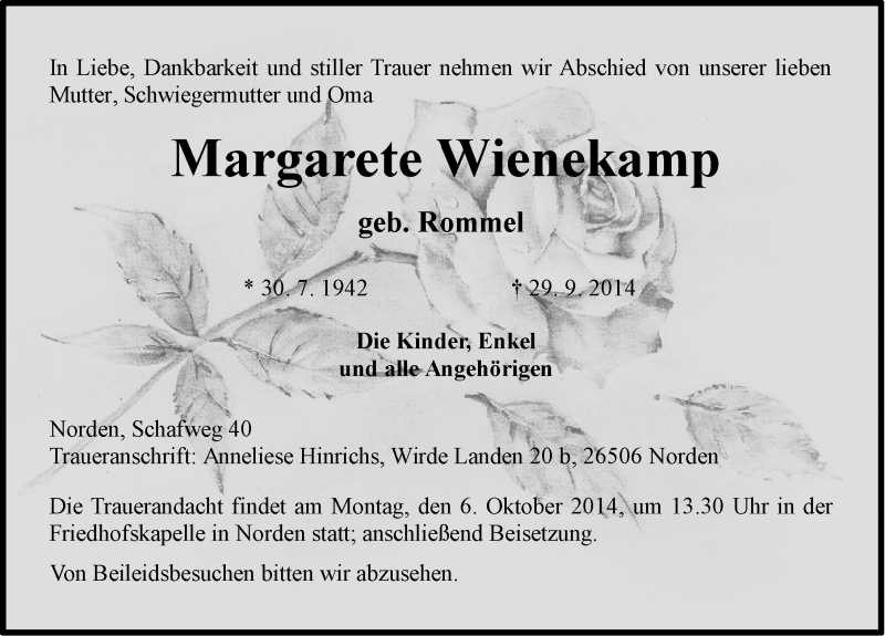 Hier finden Sie alle Traueranzeigen aus der Zeitung, die bisher für Margarete Wienekamp erschienen sind. Weitere Traueranzeigen, die in der Zeitung erscheinen, werden hier ebenfalls aufgelistet