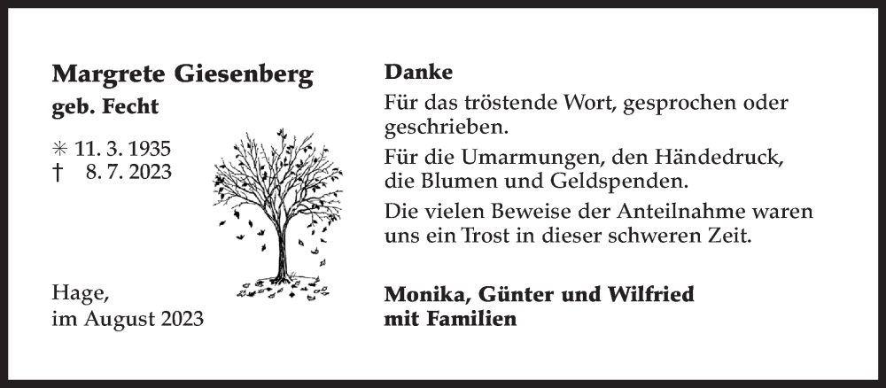 Hier finden Sie alle Traueranzeigen aus der Zeitung, die bisher für Margrete Giesenberg erschienen sind. Weitere Traueranzeigen, die in der Zeitung erscheinen, werden hier ebenfalls aufgelistet