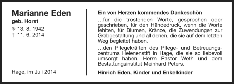 Hier finden Sie alle Traueranzeigen aus der Zeitung, die bisher für Marianne Eden erschienen sind. Weitere Traueranzeigen, die in der Zeitung erscheinen, werden hier ebenfalls aufgelistet
