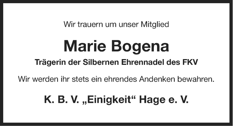 Hier finden Sie alle Traueranzeigen aus der Zeitung, die bisher für Marie Bogena erschienen sind. Weitere Traueranzeigen, die in der Zeitung erscheinen, werden hier ebenfalls aufgelistet
