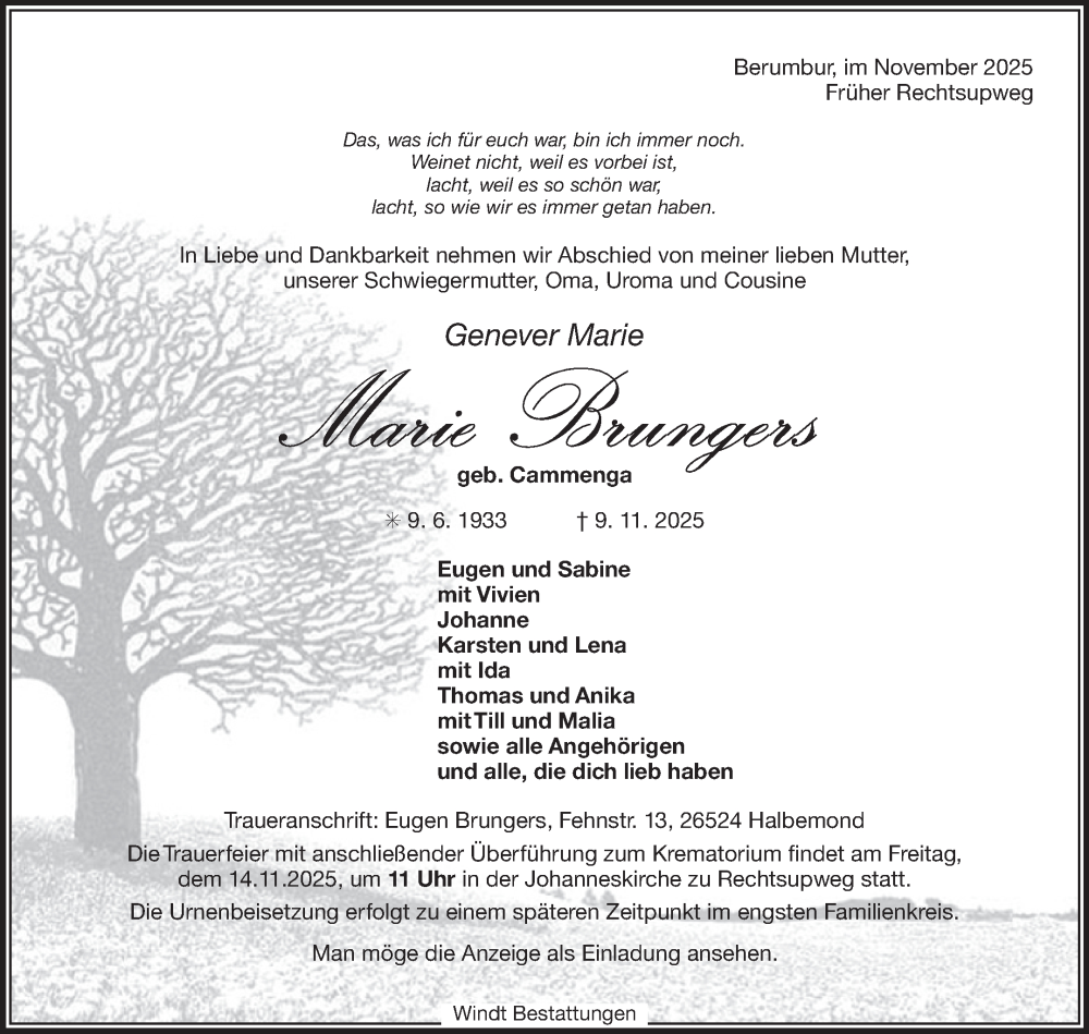 Hier finden Sie alle Traueranzeigen aus der Zeitung, die bisher für Marie Brungers erschienen sind. Weitere Traueranzeigen, die in der Zeitung erscheinen, werden hier ebenfalls aufgelistet