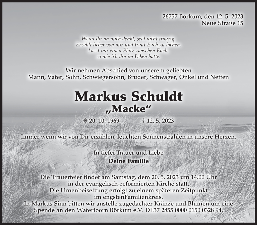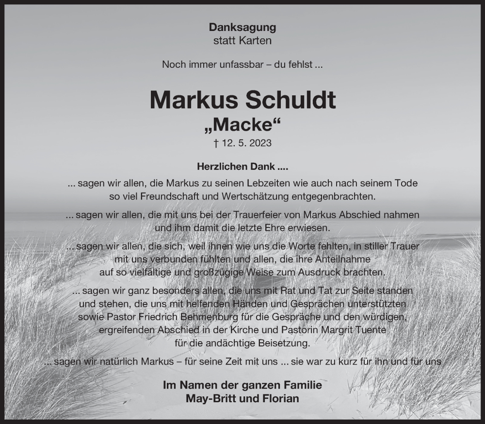 Hier finden Sie alle Traueranzeigen aus der Zeitung, die bisher für Markus Schuldt erschienen sind. Weitere Traueranzeigen, die in der Zeitung erscheinen, werden hier ebenfalls aufgelistet