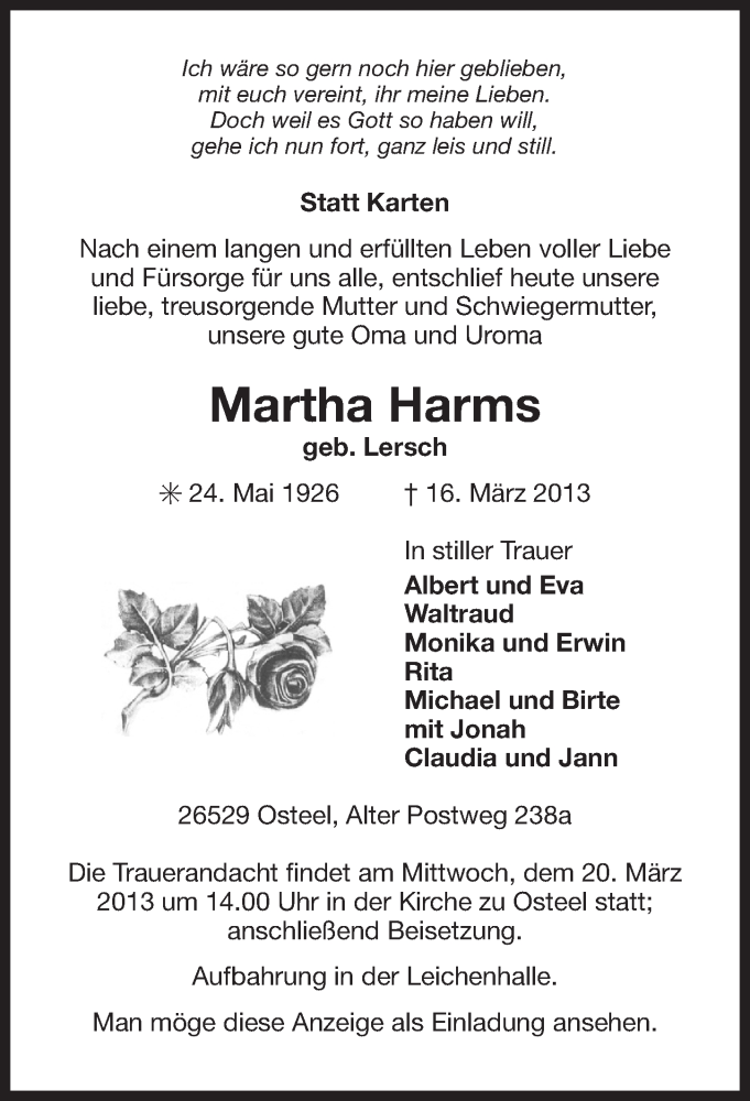 Hier finden Sie alle Traueranzeigen aus der Zeitung, die bisher für Martha Harms erschienen sind. Weitere Traueranzeigen, die in der Zeitung erscheinen, werden hier ebenfalls aufgelistet