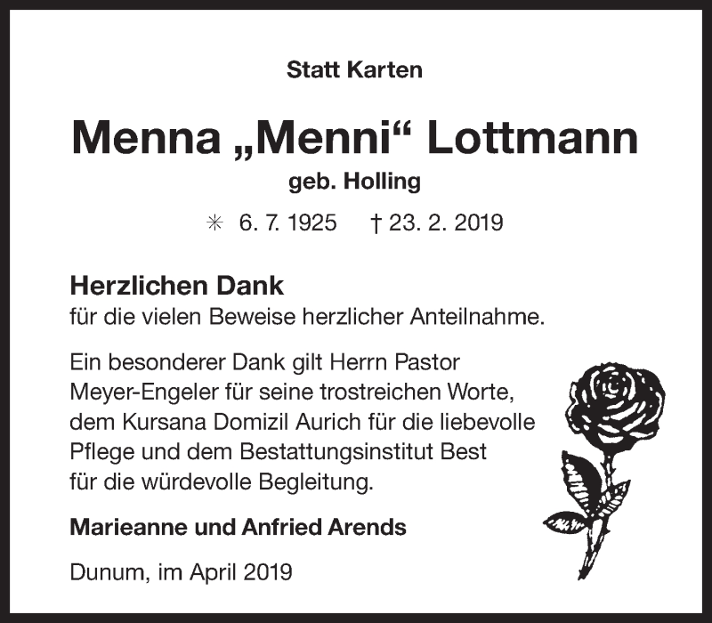 Hier finden Sie alle Traueranzeigen aus der Zeitung, die bisher für Menna Lottmann erschienen sind. Weitere Traueranzeigen, die in der Zeitung erscheinen, werden hier ebenfalls aufgelistet