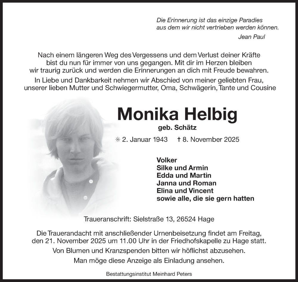 Hier finden Sie alle Traueranzeigen aus der Zeitung, die bisher für Monika Helbig erschienen sind. Weitere Traueranzeigen, die in der Zeitung erscheinen, werden hier ebenfalls aufgelistet