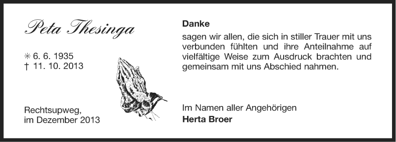 Hier finden Sie alle Traueranzeigen aus der Zeitung, die bisher für Peta Thesinga erschienen sind. Weitere Traueranzeigen, die in der Zeitung erscheinen, werden hier ebenfalls aufgelistet