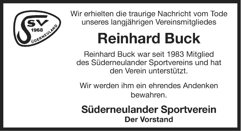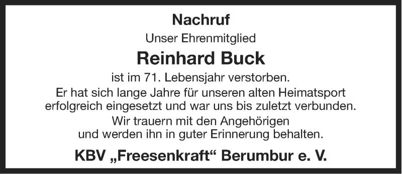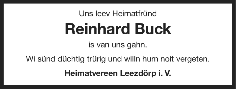 Hier finden Sie alle Traueranzeigen aus der Zeitung, die bisher für Reinhard Buck erschienen sind. Weitere Traueranzeigen, die in der Zeitung erscheinen, werden hier ebenfalls aufgelistet