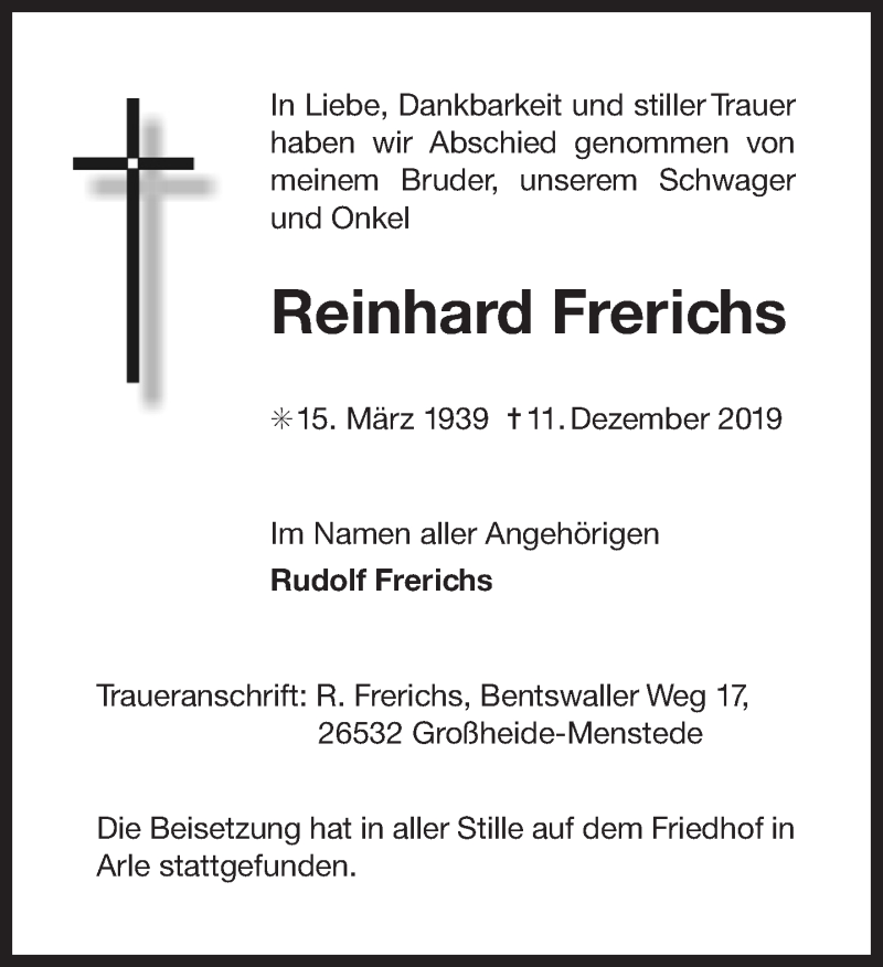 Hier finden Sie alle Traueranzeigen aus der Zeitung, die bisher für Reinhard Frerichs erschienen sind. Weitere Traueranzeigen, die in der Zeitung erscheinen, werden hier ebenfalls aufgelistet