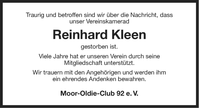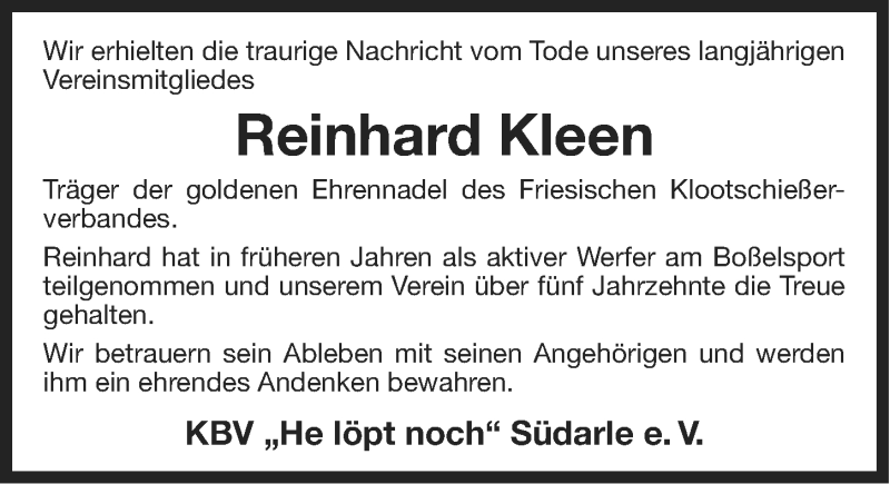 Hier finden Sie alle Traueranzeigen aus der Zeitung, die bisher für Reinhard Kleen erschienen sind. Weitere Traueranzeigen, die in der Zeitung erscheinen, werden hier ebenfalls aufgelistet