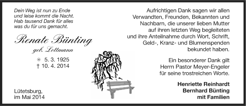 Hier finden Sie alle Traueranzeigen aus der Zeitung, die bisher für Renate Bünting erschienen sind. Weitere Traueranzeigen, die in der Zeitung erscheinen, werden hier ebenfalls aufgelistet