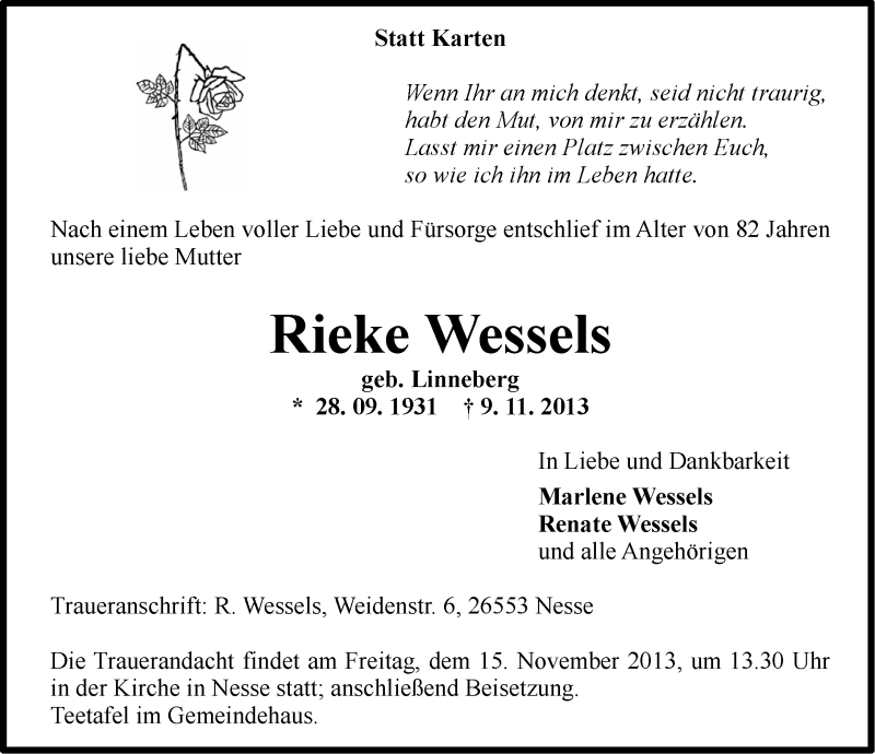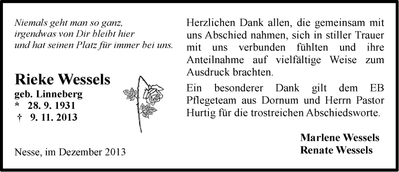 Hier finden Sie alle Traueranzeigen aus der Zeitung, die bisher für Rieke Wessels erschienen sind. Weitere Traueranzeigen, die in der Zeitung erscheinen, werden hier ebenfalls aufgelistet