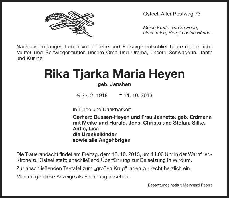 Hier finden Sie alle Traueranzeigen aus der Zeitung, die bisher für Rika Tjarka Maria Heyen erschienen sind. Weitere Traueranzeigen, die in der Zeitung erscheinen, werden hier ebenfalls aufgelistet