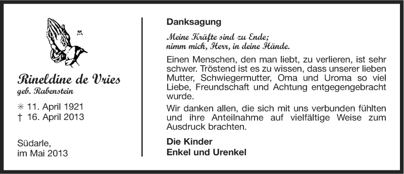 Hier finden Sie alle Traueranzeigen aus der Zeitung, die bisher für Rineldine de Vries erschienen sind. Weitere Traueranzeigen, die in der Zeitung erscheinen, werden hier ebenfalls aufgelistet