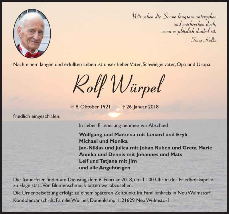 Hier finden Sie alle Traueranzeigen aus der Zeitung, die bisher für Rolf Würpel erschienen sind. Weitere Traueranzeigen, die in der Zeitung erscheinen, werden hier ebenfalls aufgelistet