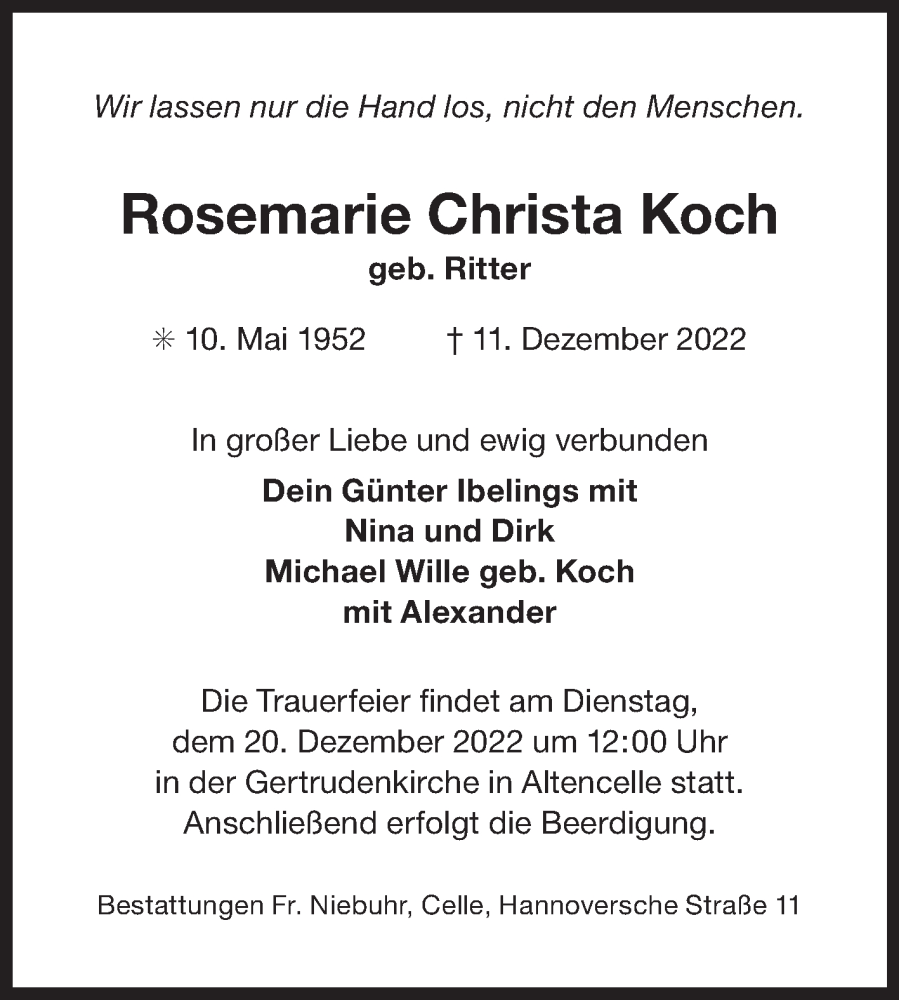 Hier finden Sie alle Traueranzeigen aus der Zeitung, die bisher für Rosemarie Christa Koch erschienen sind. Weitere Traueranzeigen, die in der Zeitung erscheinen, werden hier ebenfalls aufgelistet