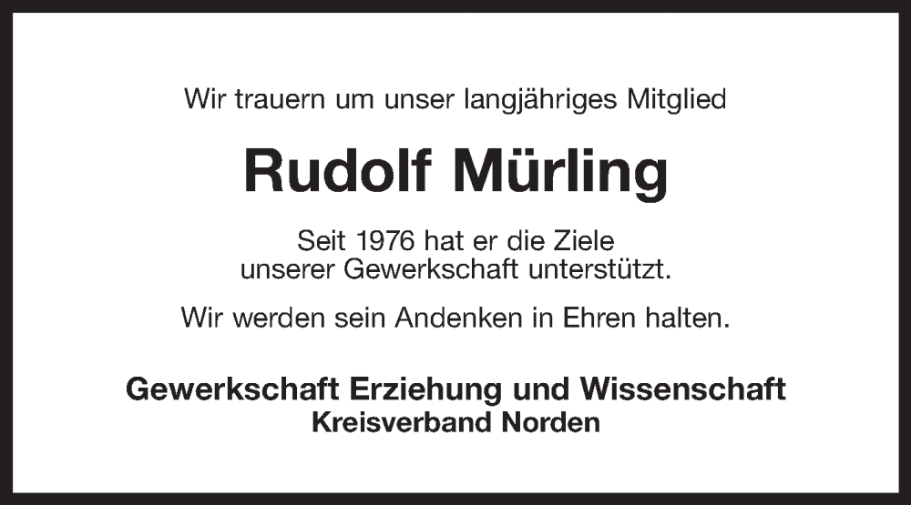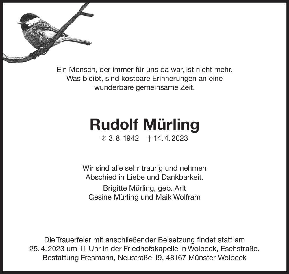 Hier finden Sie alle Traueranzeigen aus der Zeitung, die bisher für Rudolf Mürling erschienen sind. Weitere Traueranzeigen, die in der Zeitung erscheinen, werden hier ebenfalls aufgelistet