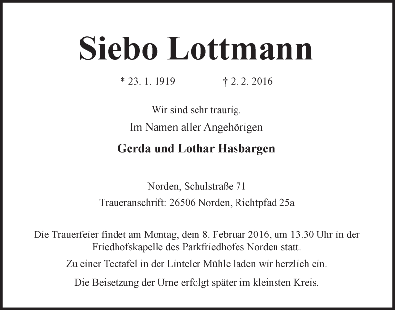 Hier finden Sie alle Traueranzeigen aus der Zeitung, die bisher für Siebo Lottmann erschienen sind. Weitere Traueranzeigen, die in der Zeitung erscheinen, werden hier ebenfalls aufgelistet