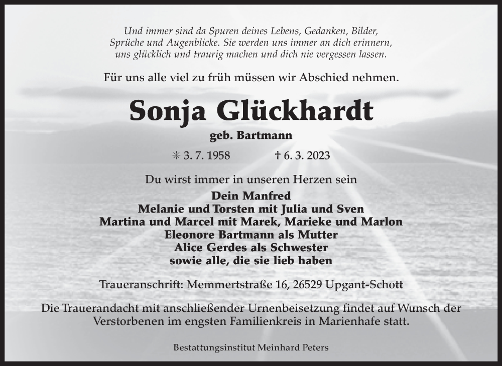Hier finden Sie alle Traueranzeigen aus der Zeitung, die bisher für Sonja Glückhardt erschienen sind. Weitere Traueranzeigen, die in der Zeitung erscheinen, werden hier ebenfalls aufgelistet