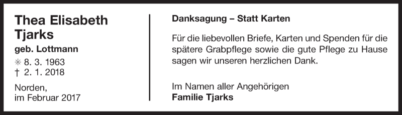 Hier finden Sie alle Traueranzeigen aus der Zeitung, die bisher für Thea Elisabeth Tjarks erschienen sind. Weitere Traueranzeigen, die in der Zeitung erscheinen, werden hier ebenfalls aufgelistet