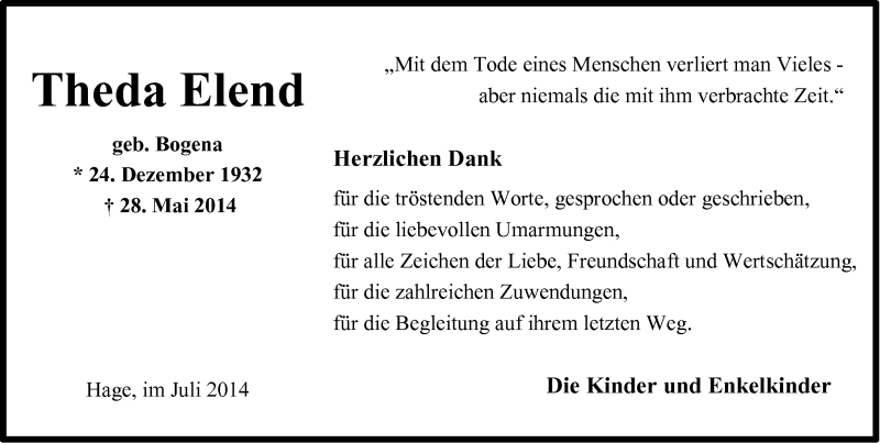 Hier finden Sie alle Traueranzeigen aus der Zeitung, die bisher für Theda Elend erschienen sind. Weitere Traueranzeigen, die in der Zeitung erscheinen, werden hier ebenfalls aufgelistet