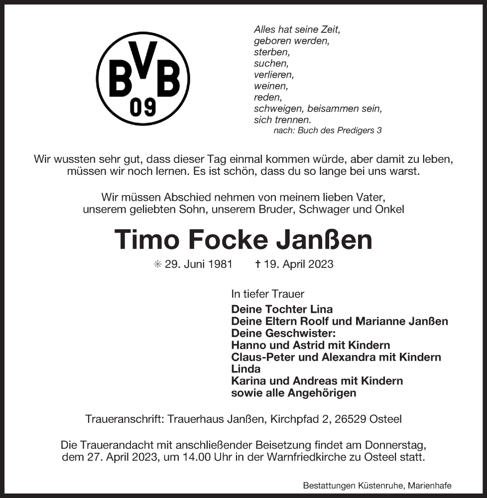 Hier finden Sie alle Traueranzeigen aus der Zeitung, die bisher für Timo Focke Janßen erschienen sind. Weitere Traueranzeigen, die in der Zeitung erscheinen, werden hier ebenfalls aufgelistet
