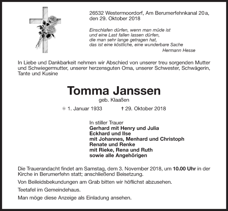 Hier finden Sie alle Traueranzeigen aus der Zeitung, die bisher für Tomma Jansse erschienen sind. Weitere Traueranzeigen, die in der Zeitung erscheinen, werden hier ebenfalls aufgelistet