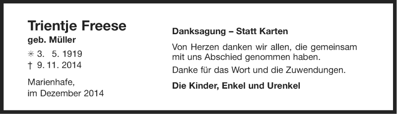 Hier finden Sie alle Traueranzeigen aus der Zeitung, die bisher für Trientje Freese erschienen sind. Weitere Traueranzeigen, die in der Zeitung erscheinen, werden hier ebenfalls aufgelistet