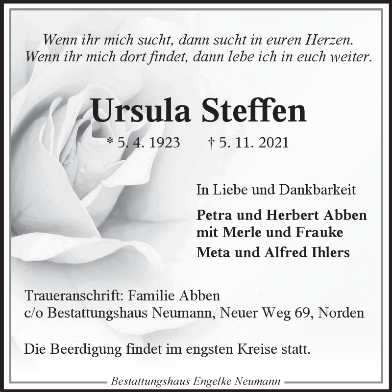 Hier finden Sie alle Traueranzeigen aus der Zeitung, die bisher für Ursula Steffen erschienen sind. Weitere Traueranzeigen, die in der Zeitung erscheinen, werden hier ebenfalls aufgelistet