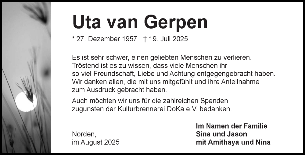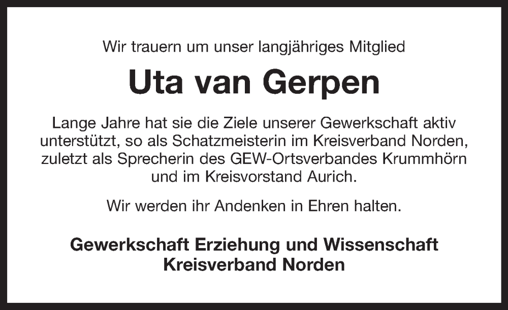 Hier finden Sie alle Traueranzeigen aus der Zeitung, die bisher für Uta van Gerpen erschienen sind. Weitere Traueranzeigen, die in der Zeitung erscheinen, werden hier ebenfalls aufgelistet