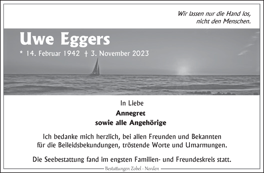 Hier finden Sie alle Traueranzeigen aus der Zeitung, die bisher für Uwe Eggers erschienen sind. Weitere Traueranzeigen, die in der Zeitung erscheinen, werden hier ebenfalls aufgelistet