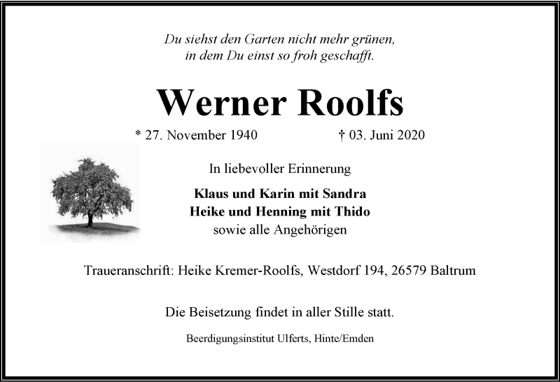 Hier finden Sie alle Traueranzeigen aus der Zeitung, die bisher für Werner Roolfs erschienen sind. Weitere Traueranzeigen, die in der Zeitung erscheinen, werden hier ebenfalls aufgelistet