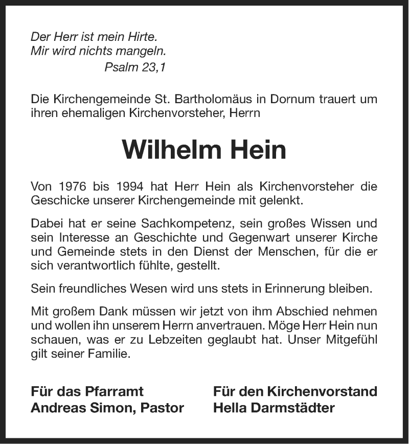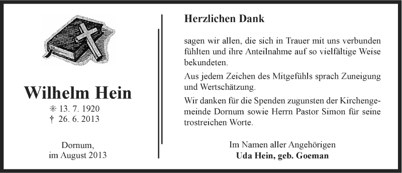 Hier finden Sie alle Traueranzeigen aus der Zeitung, die bisher für Wilhelm Hein erschienen sind. Weitere Traueranzeigen, die in der Zeitung erscheinen, werden hier ebenfalls aufgelistet